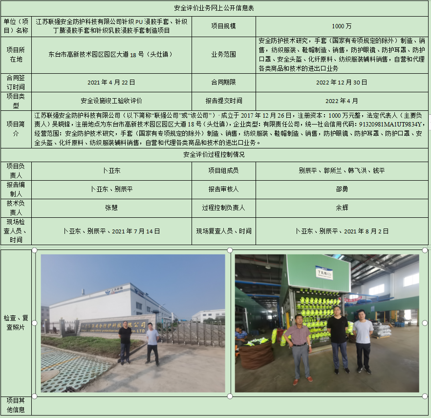 江苏联强安全防护科技有限公司针织PU浸胶手套、针织丁腈浸胶手套和针织乳胶浸胶手套制造项目