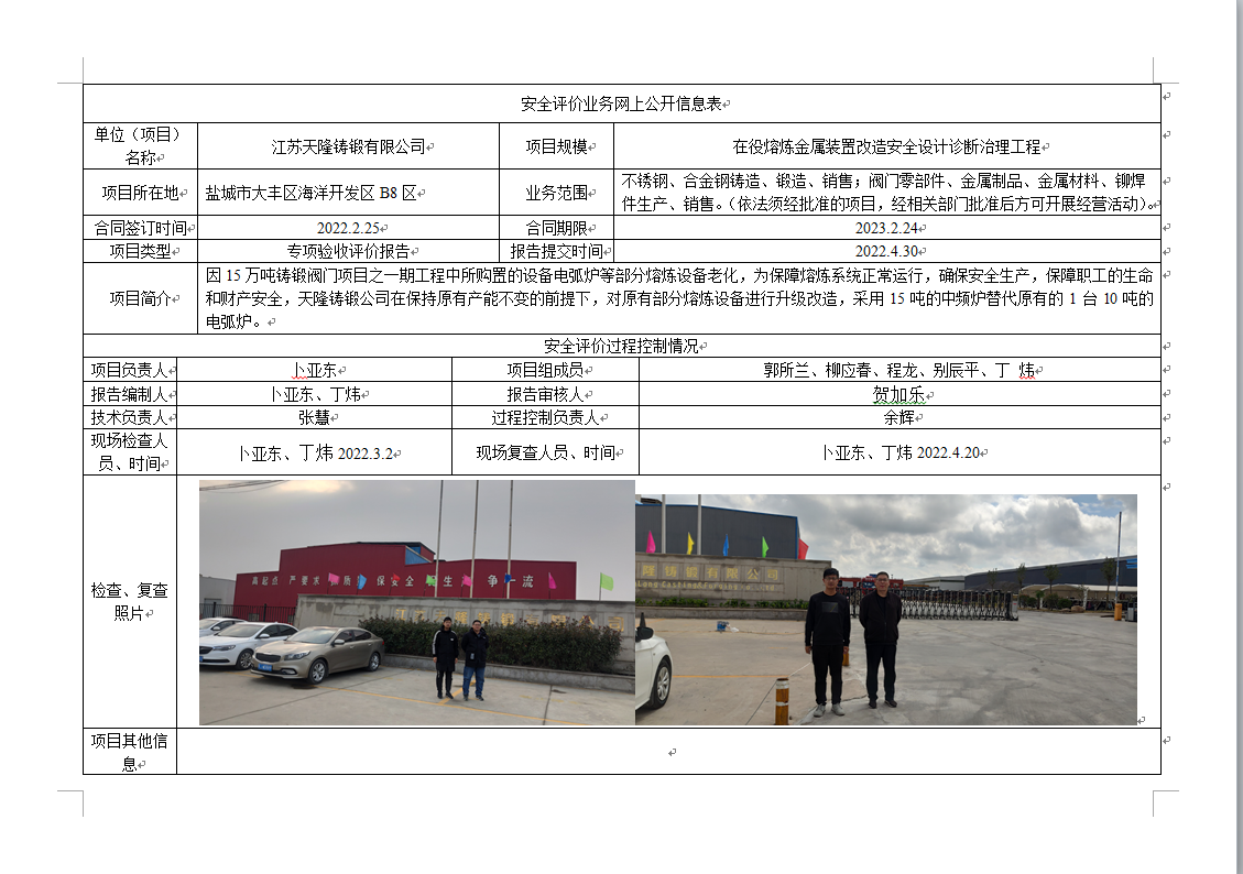 江苏天隆铸锻有限公司在役熔炼金属装置改造安全设计诊断治理工程专项验收评价报告