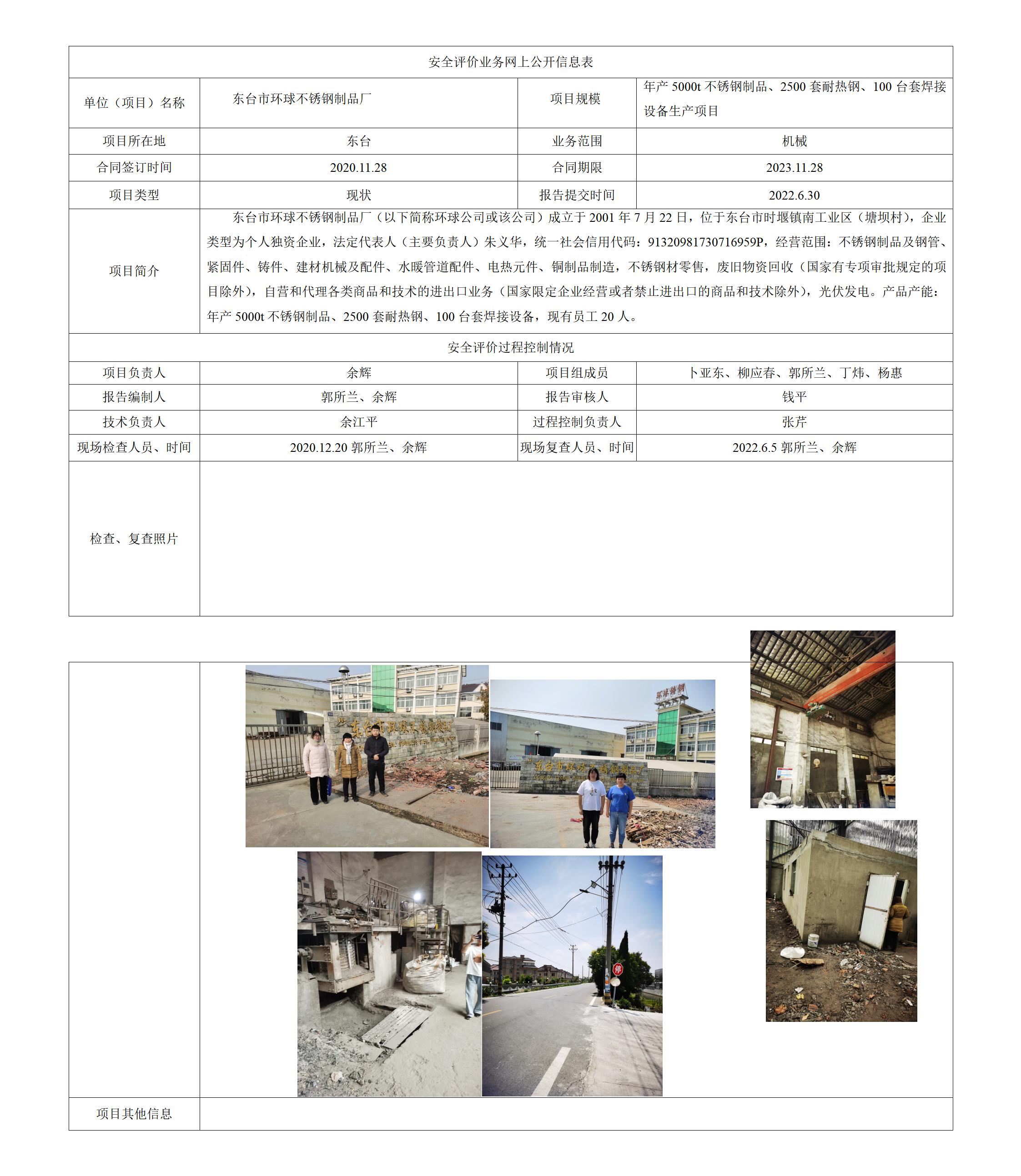 东台市环球不锈钢制品厂年产5000t不锈钢制品、2500套耐热钢、100台套焊接设备生产项目安全现状评价