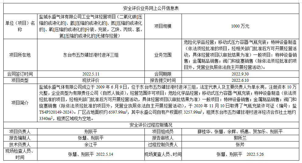 盐城永盛气体有限公司工业气体经营项目(二氧化碳[压缩的或液化的]、氩[压缩的或液化的]、氮[压缩的或液化的]、氧[压缩的或液化的]分装、充装,乙炔、丙烷、氢、氦[压缩的或液化的]无储存经营)安全评价报告
