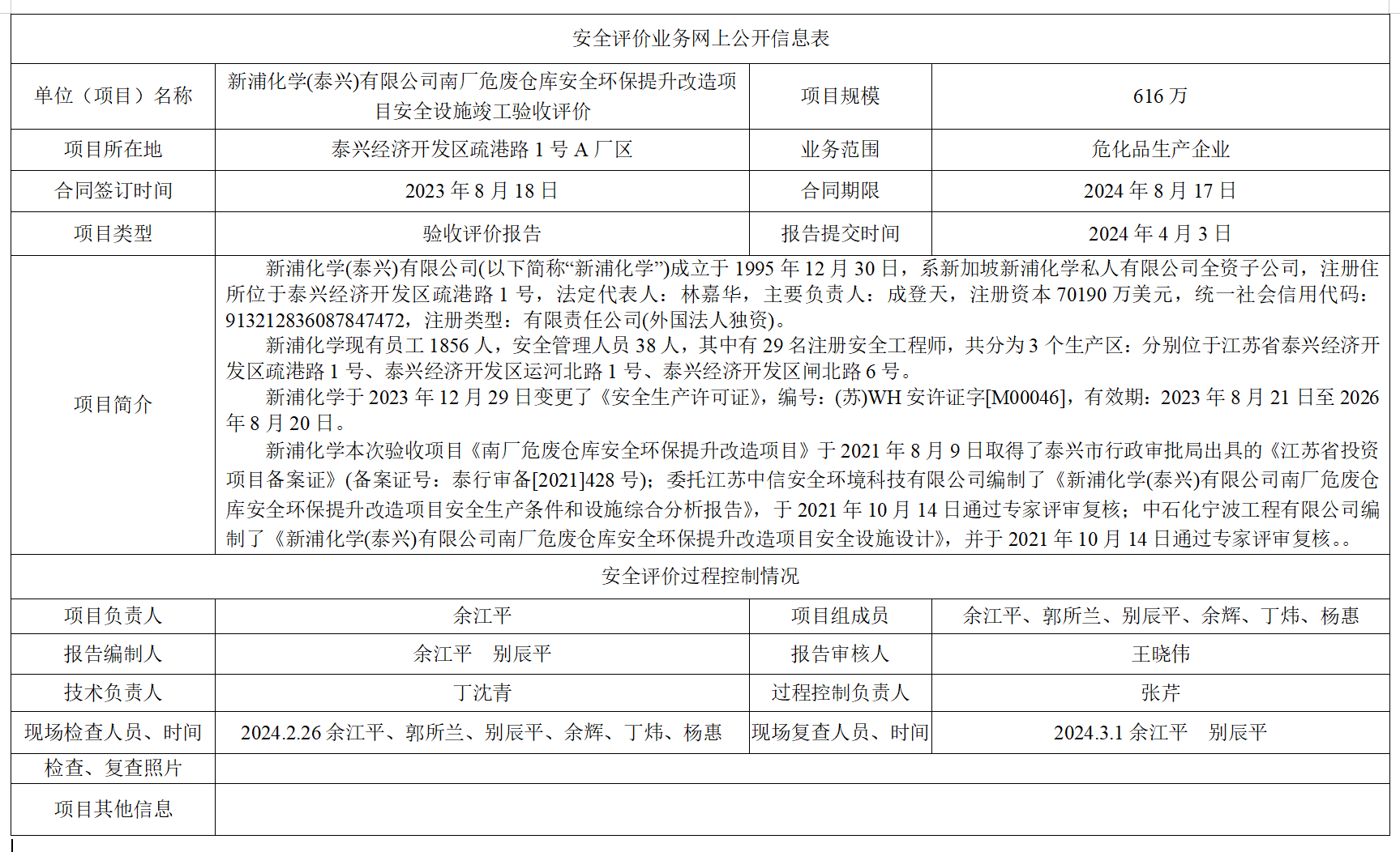 新浦化学(泰兴)有限公司南厂危废仓库安全环保提升改造项目安全设施竣工验收评价