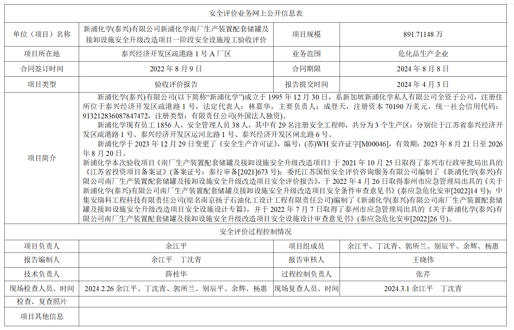新浦化学(泰兴)有限公司新浦化学南厂生产装置配套储罐及接卸设施安全升级改造项目一阶段安全设施竣工验收评价