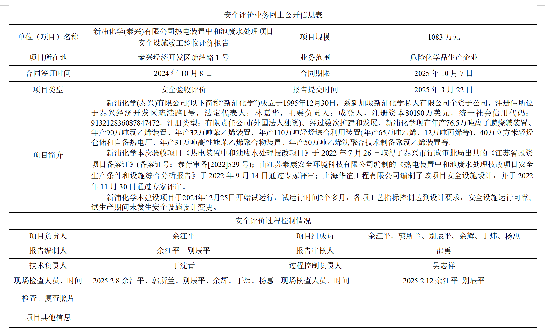 新浦化学(泰兴)有限公司热电装置中和池废水处理项目安全设施竣工验收评价报告