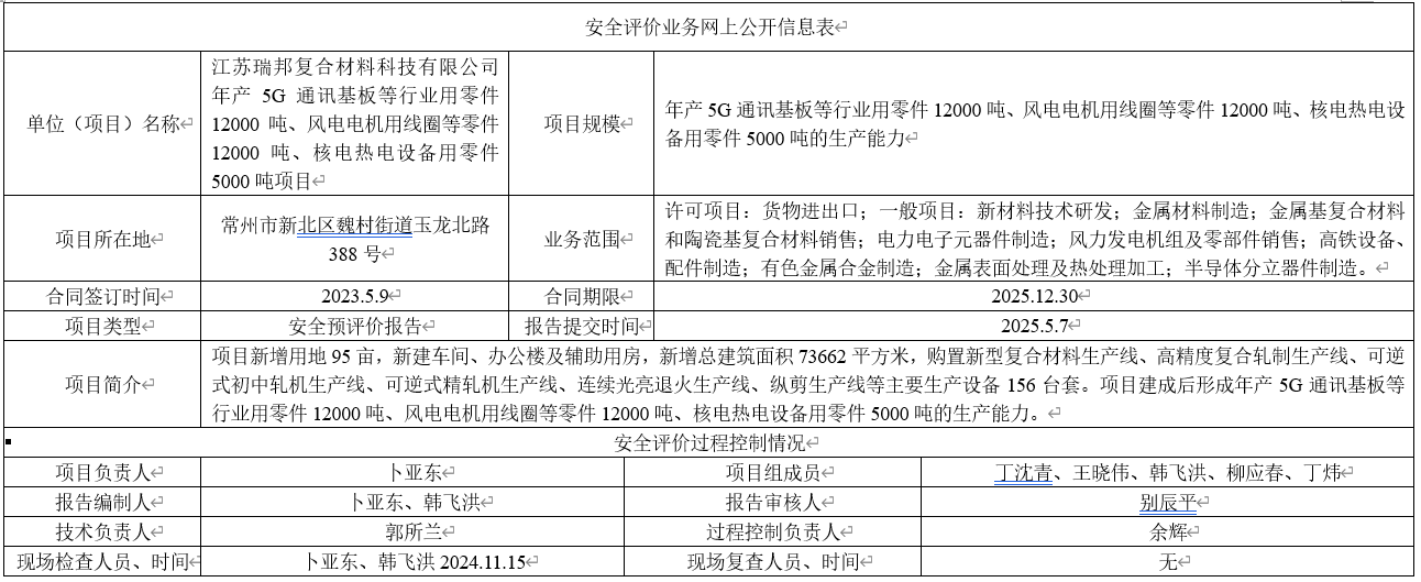 江苏瑞邦复合材料科技有限公司年产5G通讯基板等行业用零件12000吨、风电电机用线圈等零件12000吨、核电热电设备用零件5000吨项目安全预评价报告