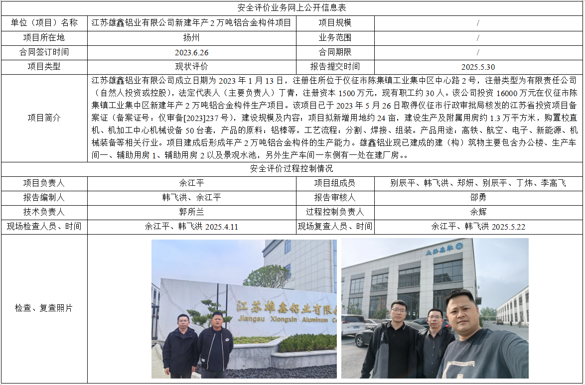 江苏雄鑫铝业有限公司新建年产2万吨铝合金构件项目