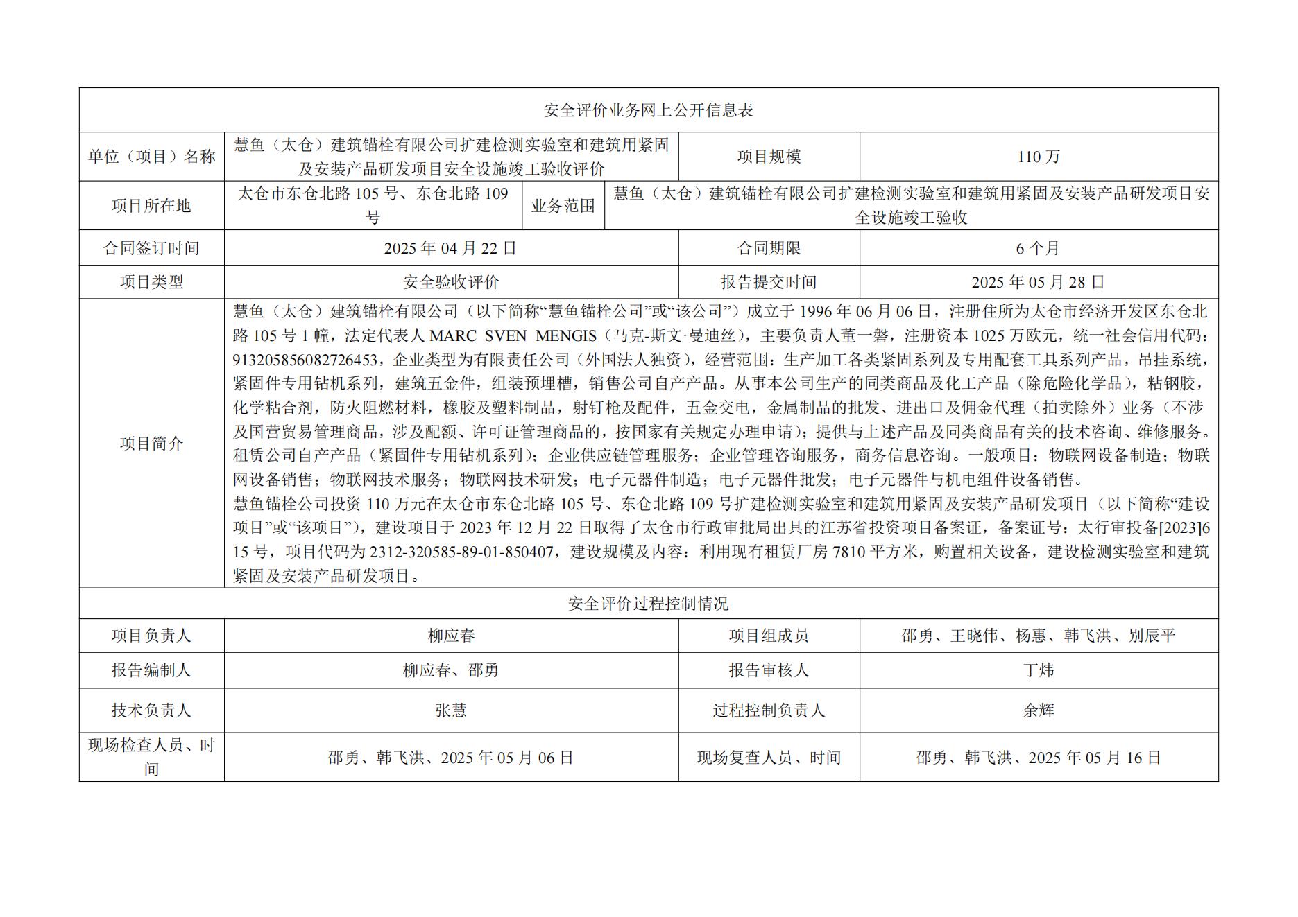 慧鱼(太仓)建筑锚栓有限公司扩建检测实验室和建筑用紧固及安装产品研发项目安全设施竣工验收评价