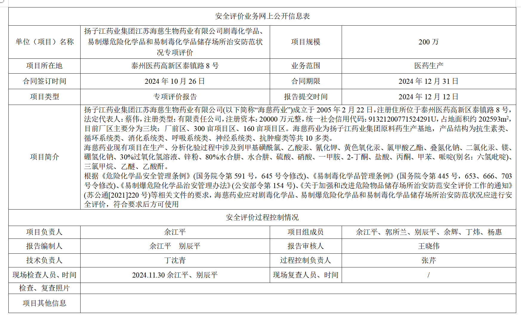 扬子江药业集团江苏海慈生物药业有限公司剧毒化学品、易制爆危险化学品和易制毒化学品储存场所治安防范状况专项评价