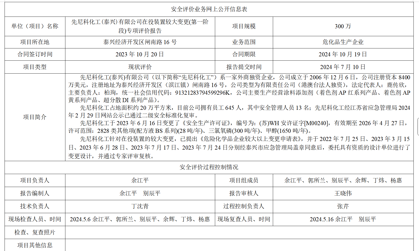 先尼科化工(泰兴)有限公司在役装置较大变更(第一阶段)专项评价报告