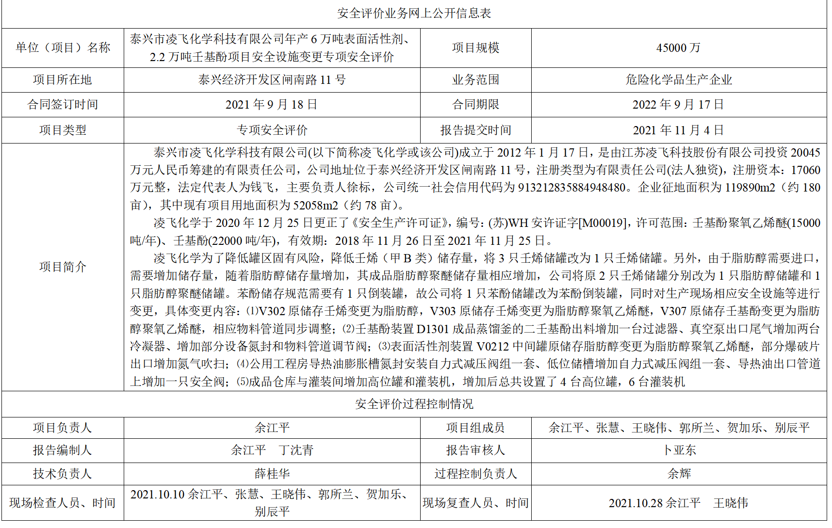 泰兴市凌飞化学科技有限公司年产6万吨表面活性剂、2.2万吨壬基酚项目安全设施变更专项安全评价