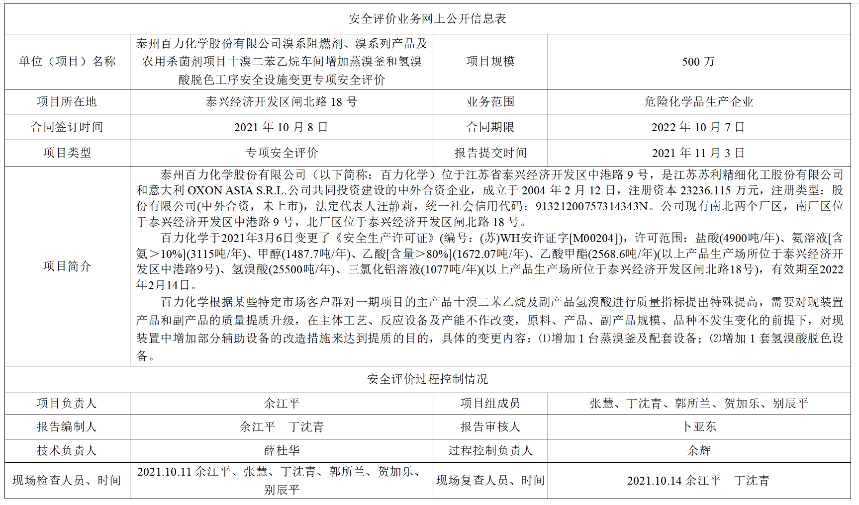 泰州百力化学股份有限公司溴系阻燃剂、溴系列产品及农用杀菌剂项目十溴二苯乙烷车间增加蒸溴釜和氢溴酸脱色工序安全设施变更专项安全评价