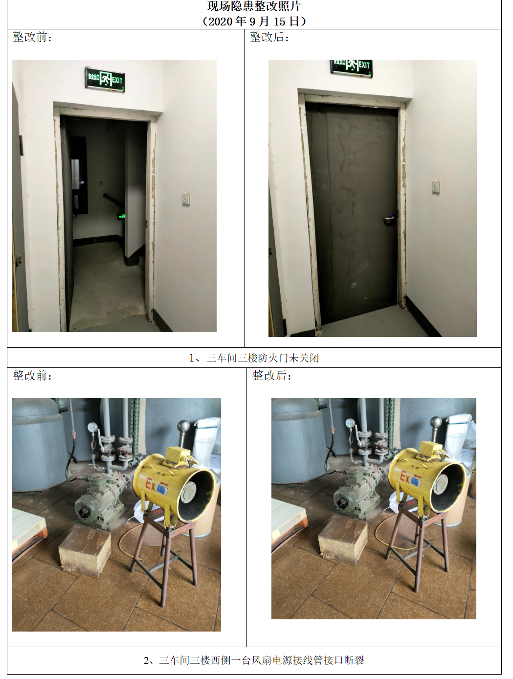 现场检查人员、时间 | 余江平、王晓伟,2020.9.12 | 现场复查人员、时间 | 余江平、王晓伟,2020.9.15 | ||