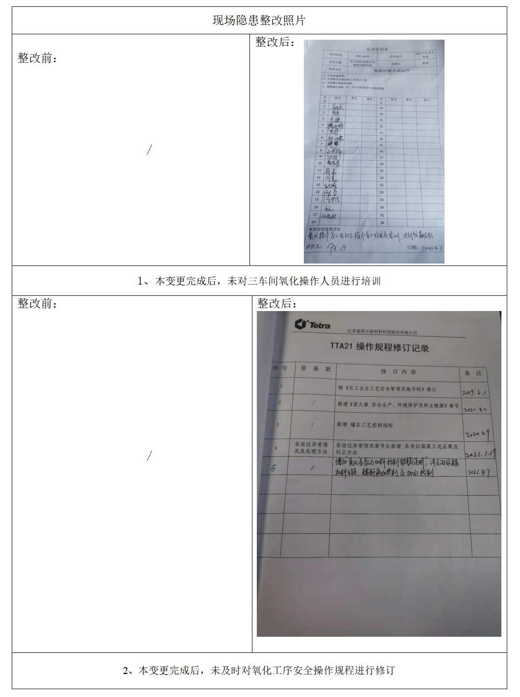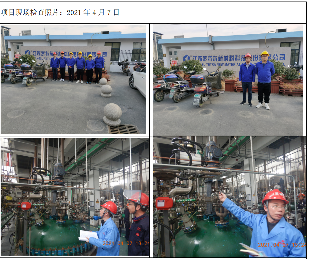 项目简介 | 江苏泰特尔新材料科技股份有限公司(以下简称:泰特尔公司)成立于2004年9月22日,注册资本4920万元,注册类型:股份有限公司(港澳台投资、未上市),法定代表人:曹祥来,主要负责人:杨胜,住所:泰兴经济开发区中港路6-2号, 社会信用代码:91321283763587284R。泰特尔公司现有员工180人,专职安全管理人员4人,主要从事精细化学品及定制化学品。泰特尔公司于2018年10月17日领取了《危险化学品安全使用许可证》,证书编号:苏(泰)安危化使字M00006号,2020年8月5日变更了安全使用许可证,许可范围:1,3-丁二烯(840吨/年)、丙烯醛、2-丙烯醛(873.6吨/年),有效期至2021年10月16日。 泰特尔公司委托河北英科石化工程有限公司对三车间氧化反应工段自动化控制进行安全设施变更设计(含《设计修改变更单》),主要变更内容:⑴环氧化反应釜R403A~L,每只釜上二氯乙烷进料管线上均增设一只切断阀,信号送至DCS系统;⑵每只反应环氧化反应釜双环酯进料管线上均增设一只切断阀,信号送至DCS系统;⑶环氧化反应釜R403A~L醋酸酐滴加支管上分别新增一只流量计与原有调节阀形成调节回路,来精准控制其滴加速度;⑷环氧化反应釜R403A~L自来水补水管线上增设一只流量计;⑸在车间二外东南侧增加一只消防水栓。 | ||