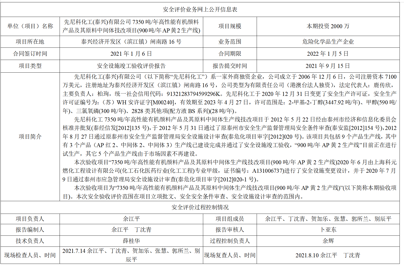 先尼科化工(泰兴)有限公司7350吨/年高性能有机颜料产品及其原料中间体技改项目(900吨/年AP黄2生产线)