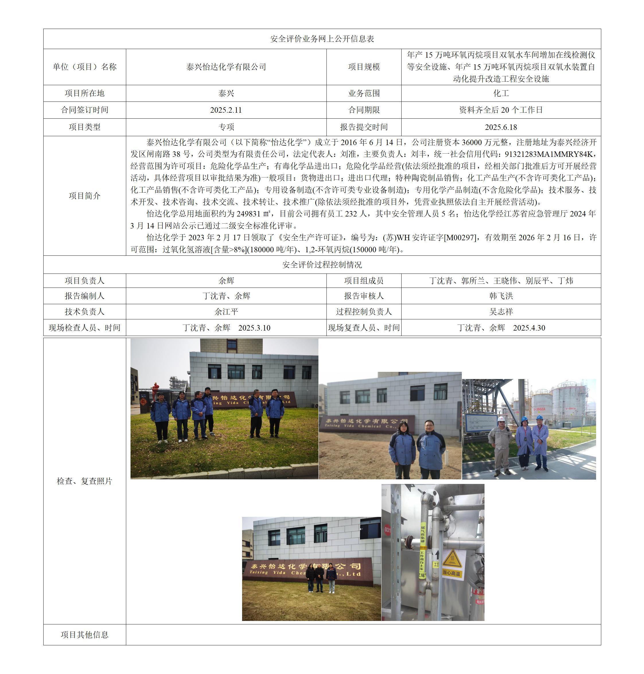泰兴怡达化学有限公司 年产15万吨环氧丙烷项目双氧水车间增加在线检测仪等安全设施、年产15万吨环氧丙烷项目双氧水装置自动化提升改造工程安全设施专项安全评价报告
