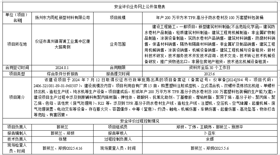 扬州东方雨虹新型材料有限公司年产200万平方米TPR高分子防水卷材及100万套塑料包装桶验收