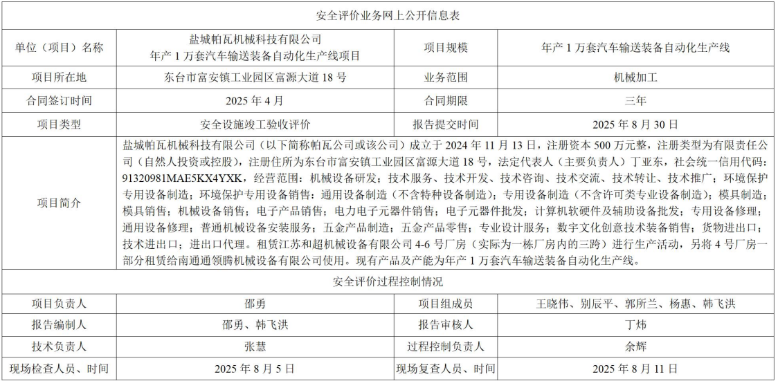 盐城帕瓦机械科技有限公司年产1万套汽车输送装备自动化生产线项目安全设施竣工验收评价报告