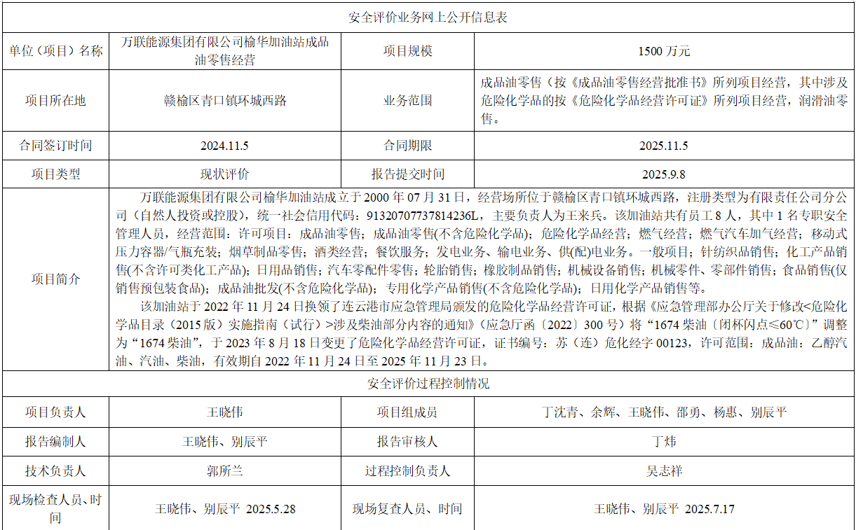 万联能源集团有限公司榆华加油站成品油零售经营安全评价报告