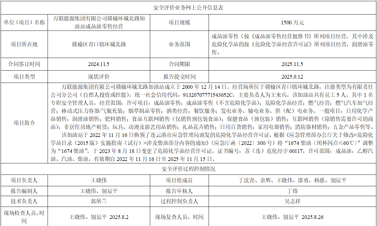 万联能源集团有限公司赣榆环城北路加油站成品油零售经营安全评价