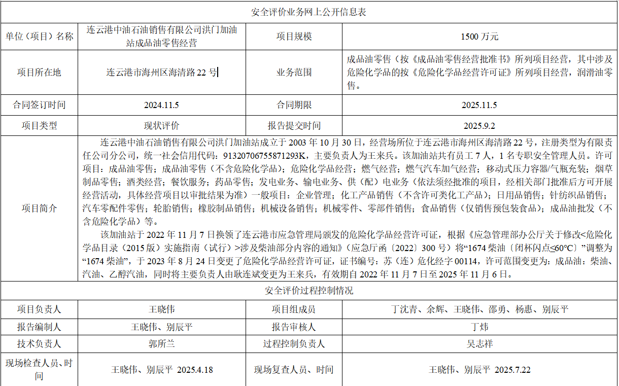 连云港中油石油销售有限公司洪门加油站成品油零售经营安全评价