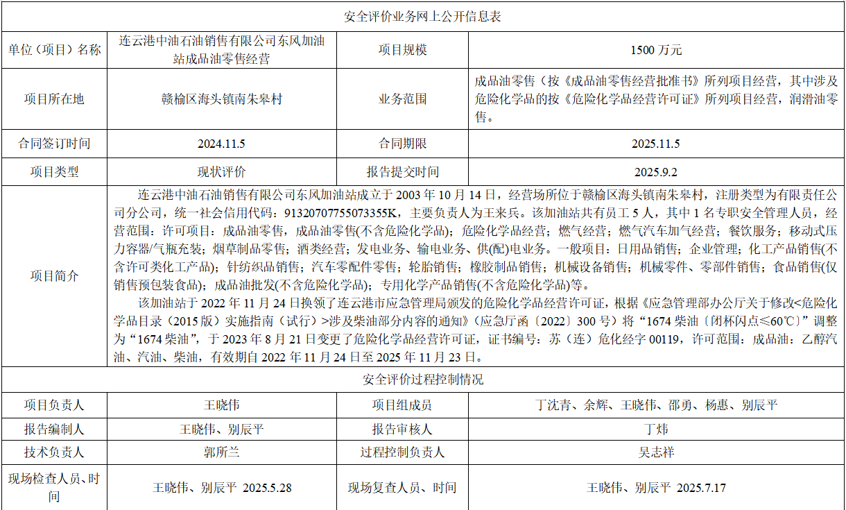 连云港中油石油销售有限公司东风加油站成品油零售经营安全评价
