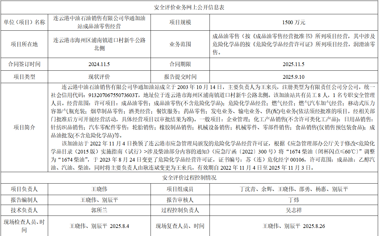 连云港中油石油销售有限公司华通加油站成品油零售经营安全评价报告