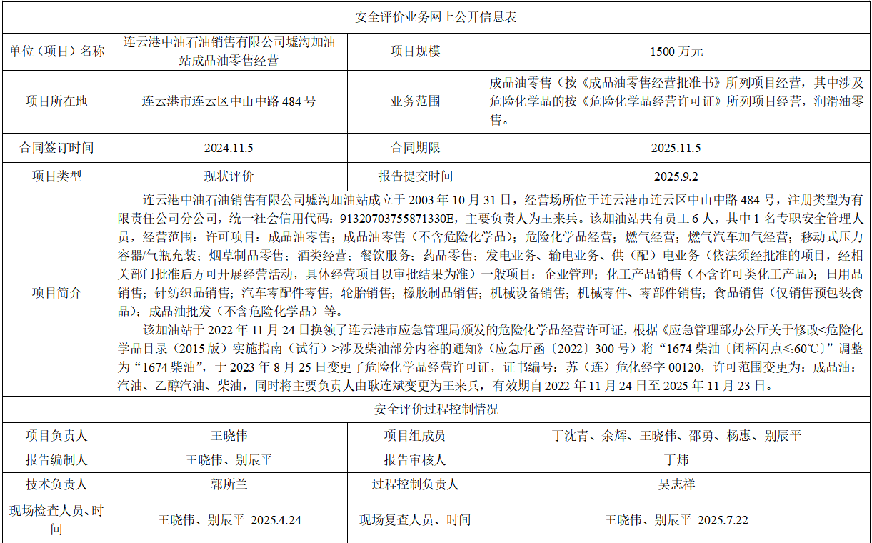 连云港中油石油销售有限公司墟沟加油站成品油零售经营安全评价报告
