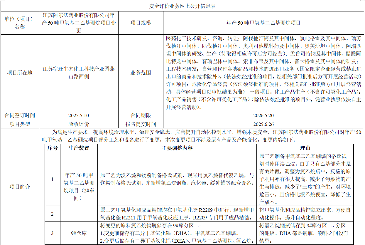 江苏阿尔法药业股份有限公司年产50吨甲氧基二乙基硼烷项目变更安全设施竣工验收评价报告
