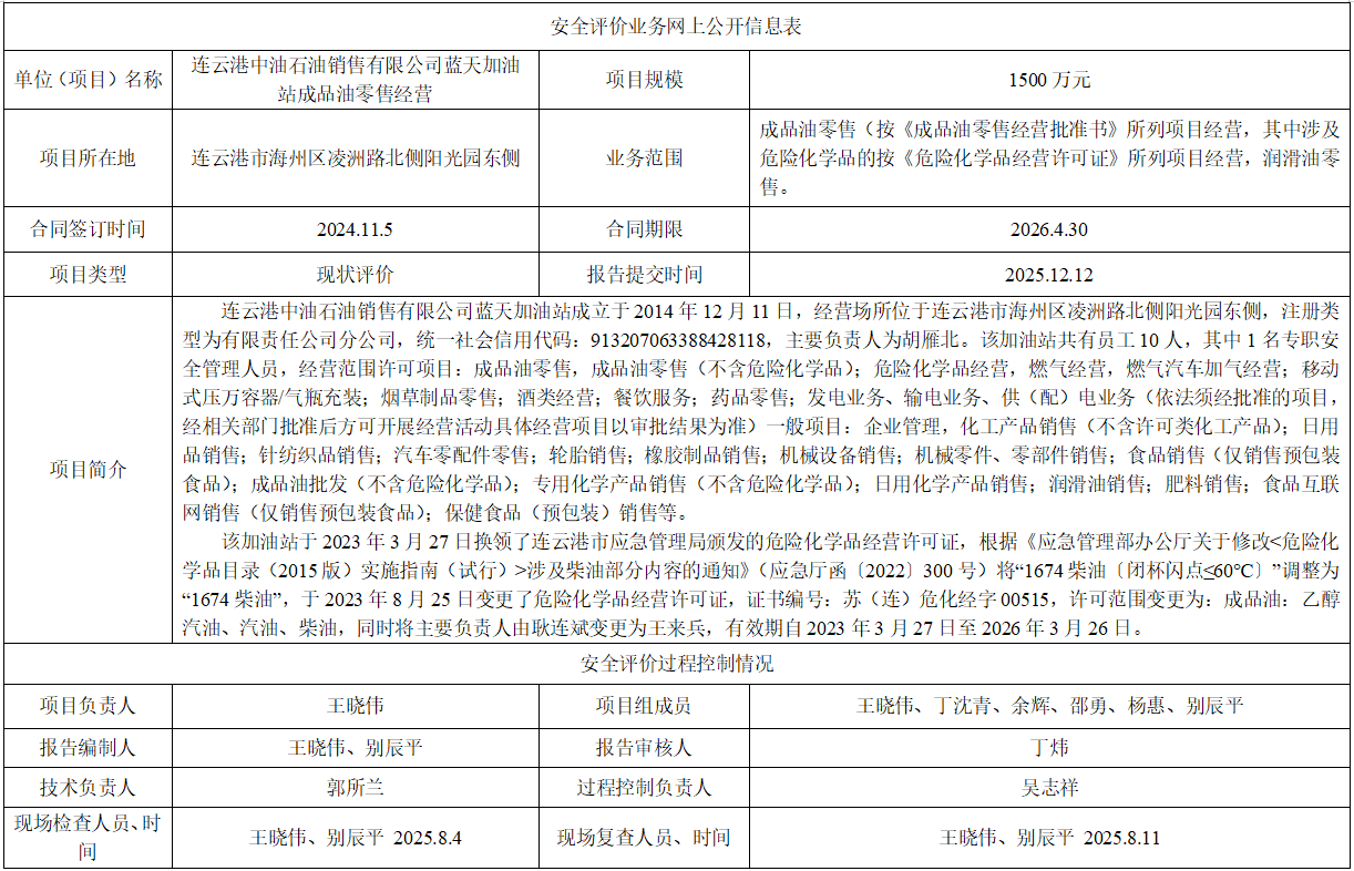 连云港中油石油销售有限公司蓝天加油站成品油零售经营项目安全评价报告