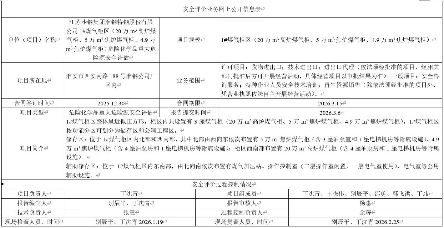 江苏沙钢集团淮钢特钢股份有限公司1#煤气柜区(20万m3高炉煤气柜、5万m3焦炉煤气柜、4.9万m3焦炉煤气柜)危险化学品重大危险源安全评估报告